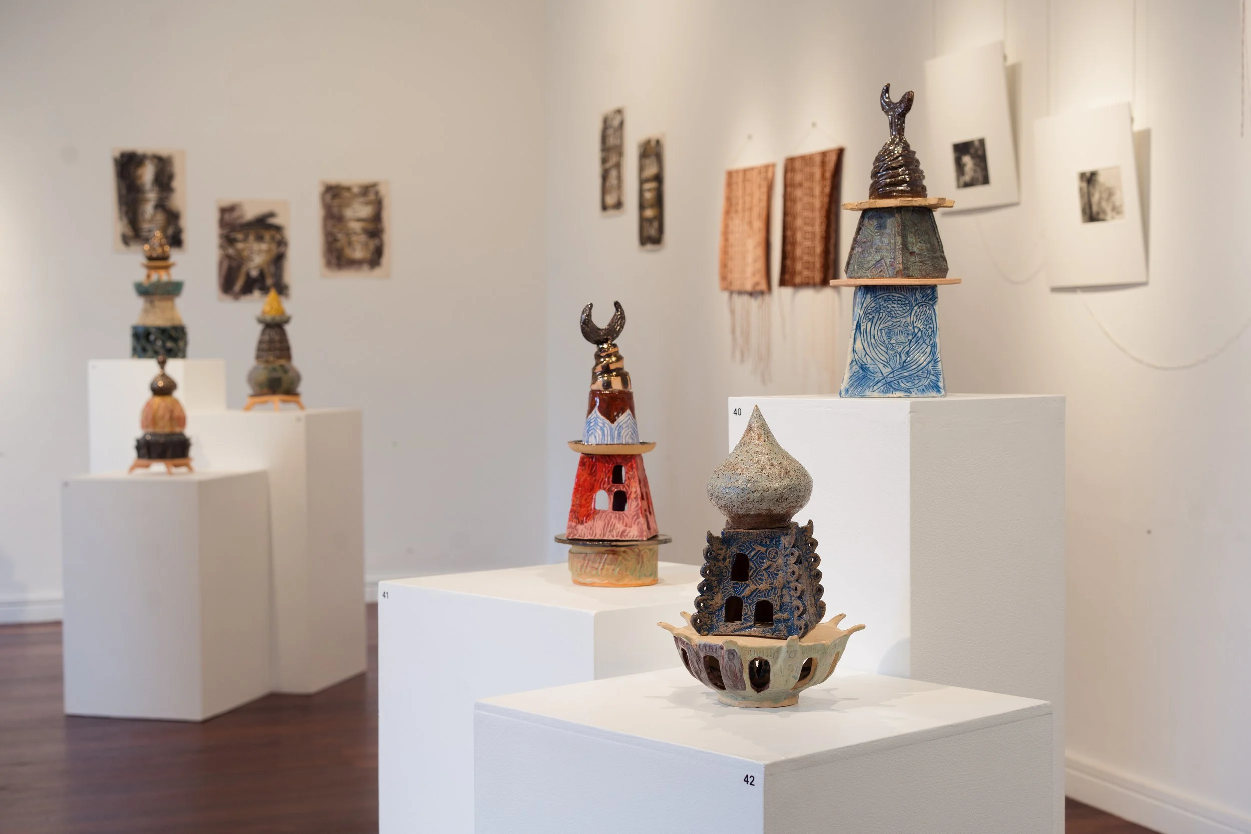 Naz works with clay—earth itself, the ground on which we stand. Clay begins soft and formless, then gradually holds shape through touch, processes of drying, and firing. His vessels, often stacked, contain stories. What we feel is that the stories are fragmented, speak of time simultaneously past and present, the faraway nearby. And I wonder, what stories, figures and words each of us would inscribe on our vessels?